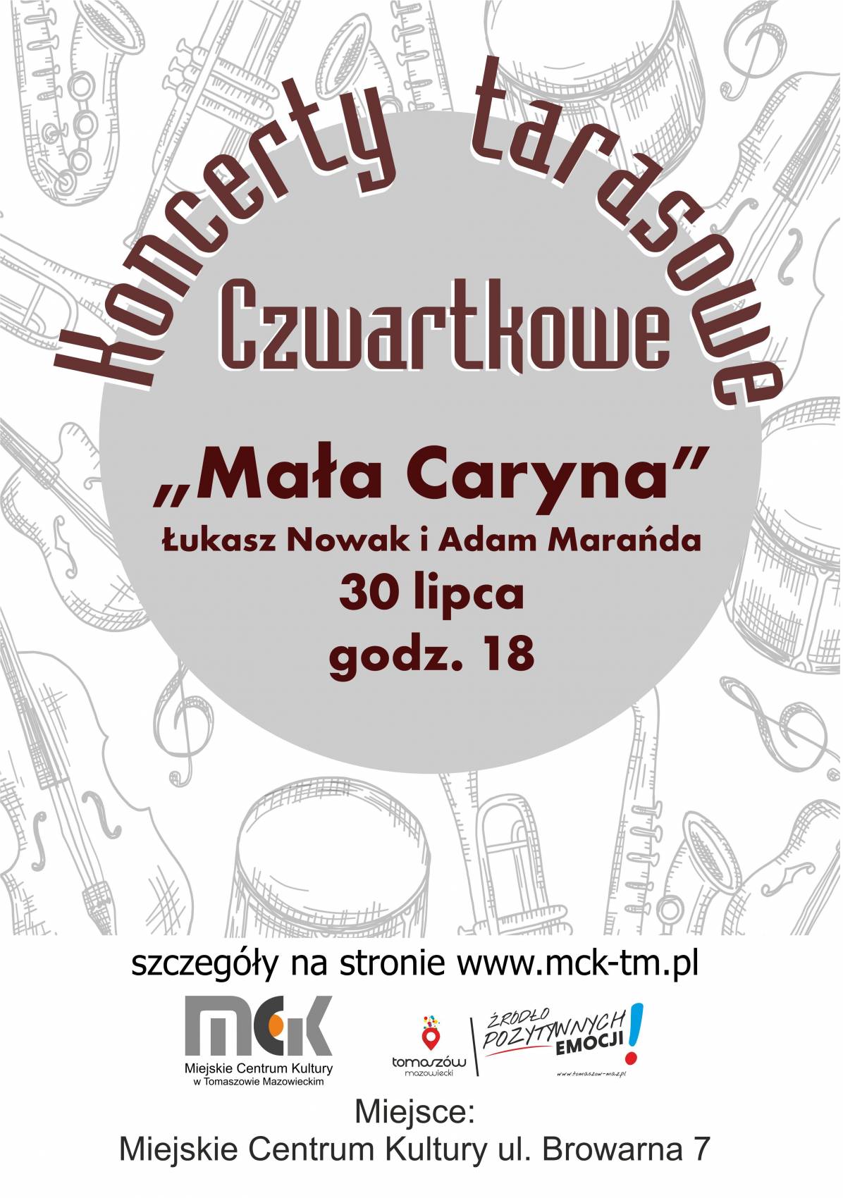 Duet muzyków – Łukasz Nowak i Adam Marańda – związanych z grupą Caryna wystąpi 30 lipca w Miejskim Centrum Kultury MOK przy ul. Browarnej 7 w ramach „Czwartkowych koncertów tarasowych". Początek wydarzenia o godz. 18. Wstęp bezpłatny.