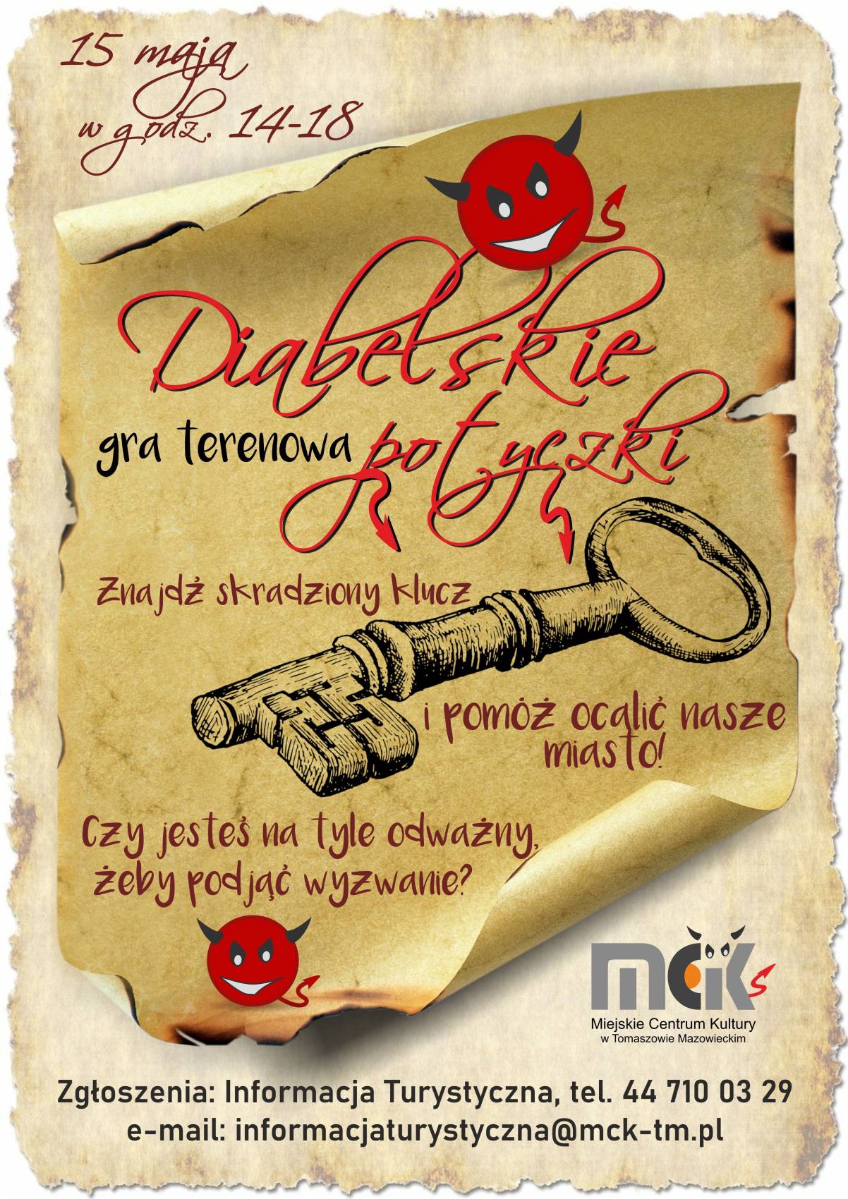 Masz odwagę podjąć wyzwanie rzucone przez diabła nagórzyckiego? Chcesz zostać bohaterem i ocalić Tomaszów Mazowiecki oraz jego mieszkańców? Miejskie Centrum Kultury zaprasza Cię do udziału w grze terenowej, w której ‒ odnajdując skradziony przez czarta klucz do miasta ‒ uchronisz tomaszowian przed diabelskimi planami.