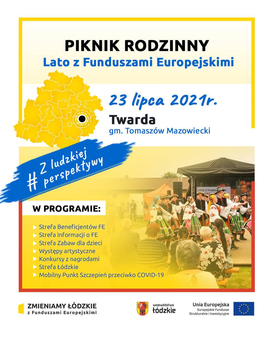 Marszałek Województwa Łódzkiego Grzegorz Schreiber zaprasza na pikniki rodzinne z Funduszami Europejskimi. To wspaniała okazja aby spędzić czas w rodzinnym gronie oraz dowiedzieć się więcej dofinansowaniach. 23 lipca bawimy się w Twardej, wydarzenie rozpoczyna się od godziny 13.00.
