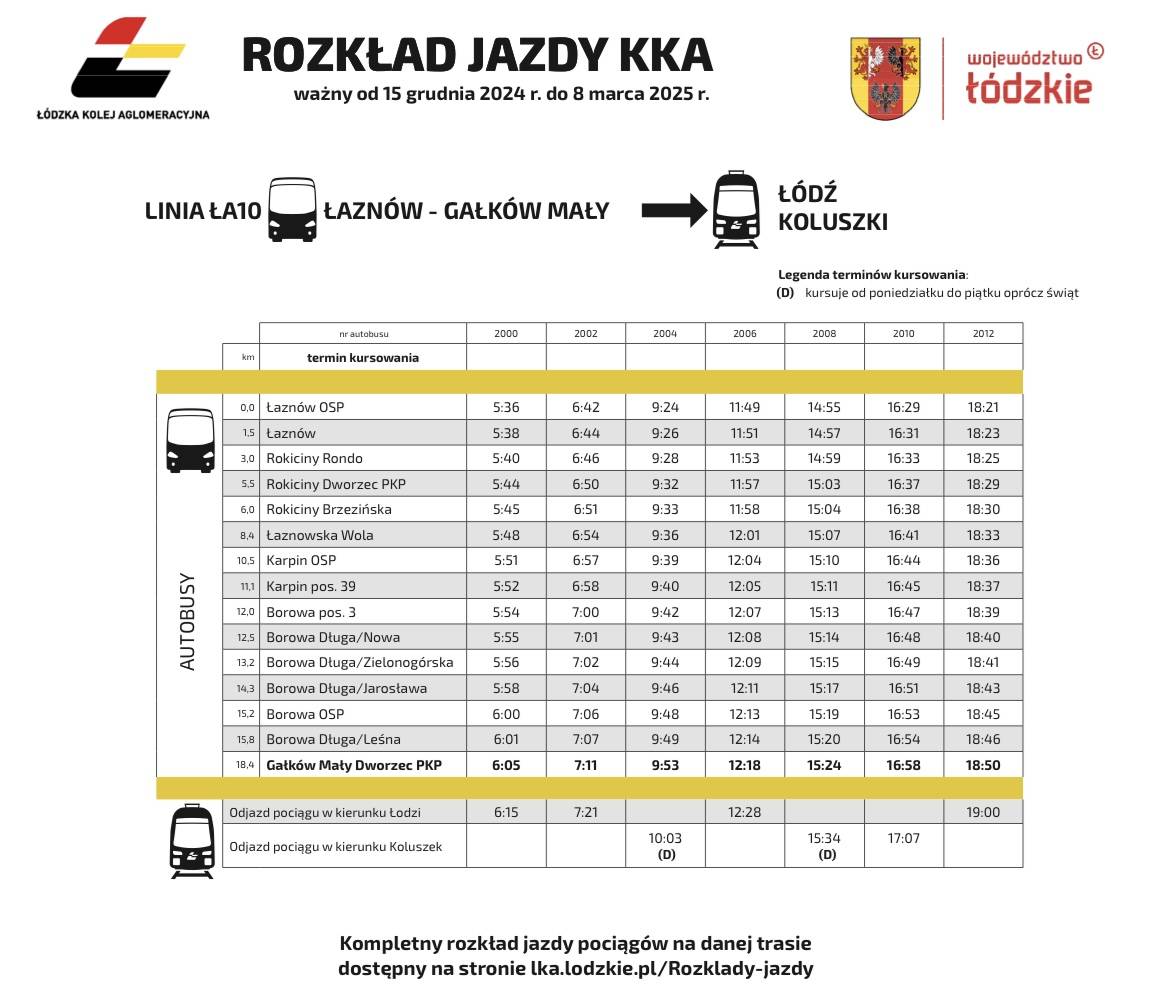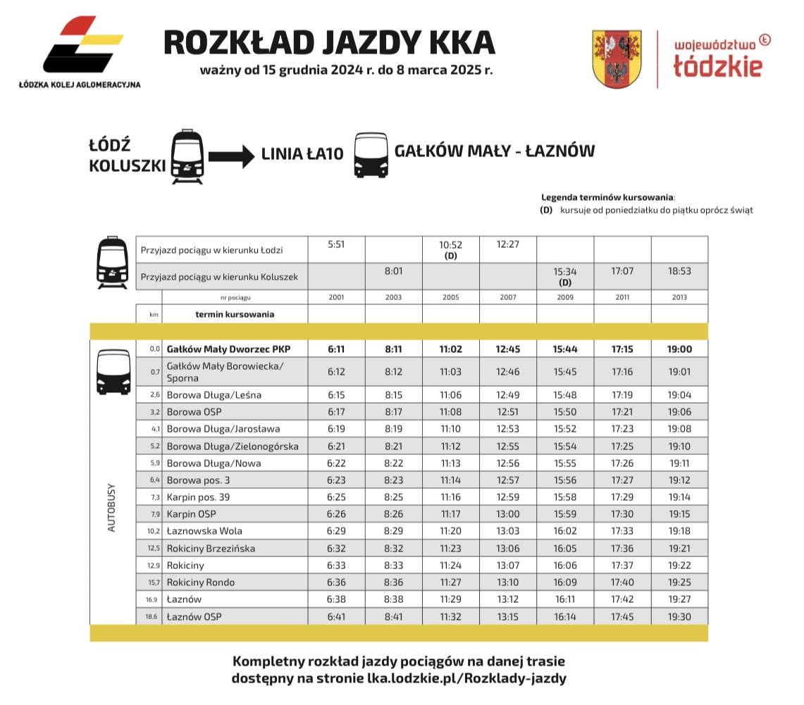 Rozkład jazdy KKA jest dopasowany do rozkładu jazdy pociągów ŁKA, co oznacza, że odjazd autobusu ze stacji przesiadkowej jest uzależniony od czasu przyjazdu skomunikowanego z nim pociągu i odwrotnie. Dzięki ofercie linia kolejowa zostanie wydłużona o trasę autobusu.