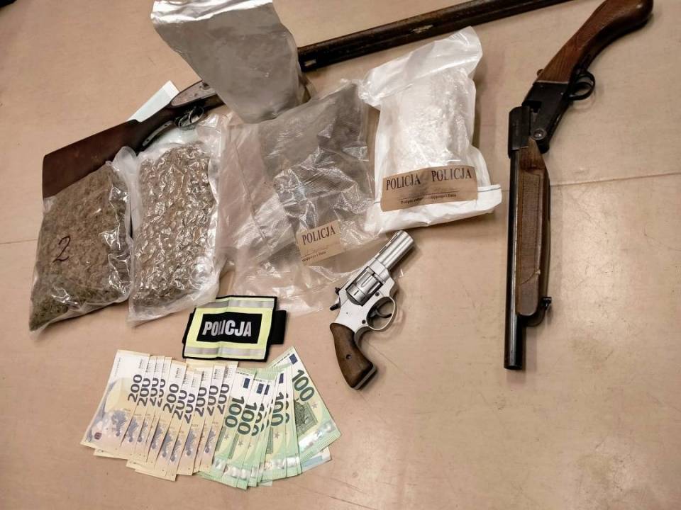 Podczas przeszukania wnętrza pojazdu policjanci znaleźli w nim hermetycznie zapakowane, foliowe opakowanie o wadze ponad 1 kilograma oraz małe zawiniątko z białym proszkiem o wadze około 0,5 grama. Badanie narkotestem wykazało, iż w obu przypadkach była to amfetamina. Mężczyzna został zatrzymany a policjanci dokonali przeszukań w jego miejscu zamieszkania i miejscach, w których przebywał. Podczas działań kryminalni zabezpieczyli kolejne trzy hermetyczne opakowania, w których znajdował się ponad kilogram marihuany a ponadto nielegalnie posiadane 3 sztuki broni palnej i ponad 130 sztuk różnego rodzaju amunicji. Ponadto mundurowi zabezpieczyli do dalszych badań quada marki yamaha gdzie usunięte zostało pole numerowe VIN i dokument tożsamości z fałszywymi danymi. Na poczet przyszłej kary policjanci zabezpieczyli od mężczyzny mienie o wartości około 70 tysięcy złotych. Mężczyzna 18 lipca 2024 roku usłyszał prokuratorskie zarzuty posiadania ponad 2 kilogramów narkotyków oraz broni palnej i amunicji bez zezwolenia. Za wymienione czyny grozi kara nawet do 10 lat pozbawienia wolności. Na wniosek prokuratora, sąd zastosował wobec 34-latka tymczasowe aresztowanie na okres 3 miesięcy.