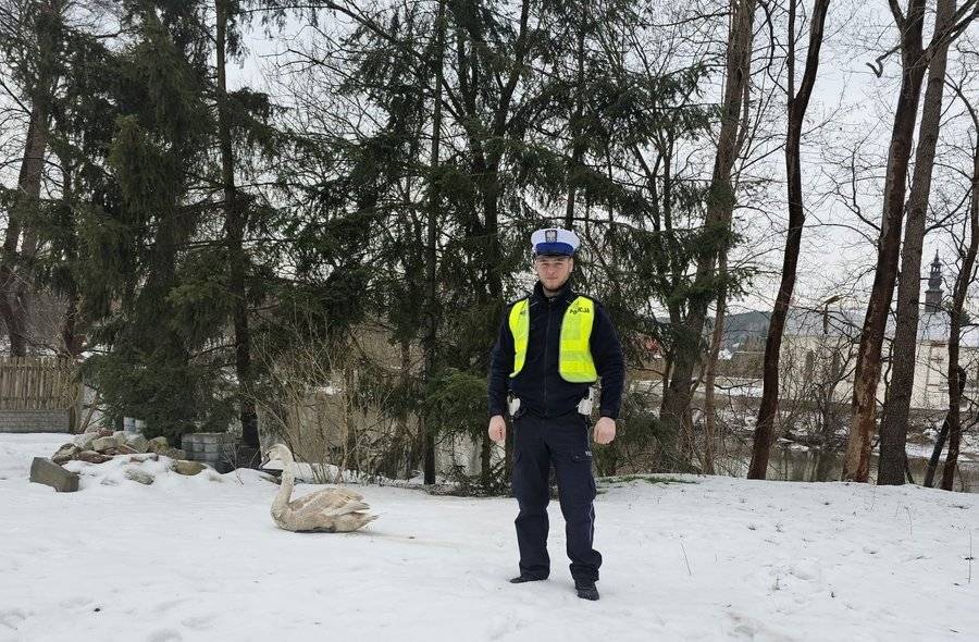 W minioną środę, 10 lutego 2026 roku przed południem policjanci Wydziału Ruchu Drogowego Komendy Powiatowej Policji w Tomaszowie Mazowieckim, pełniący służbę w miejscowości Inowłódz, podjęli nietypową, ale niezwykle ważną interwencję. Funkcjonariusze zostali poinformowani przez przejeżdżającego mężczyznę, że na moście na drodze krajowej numer 48, nad rzeką Pilicą, znajduje się młody łabędź, który zakleszczył się pomiędzy elementami konstrukcji mostu.