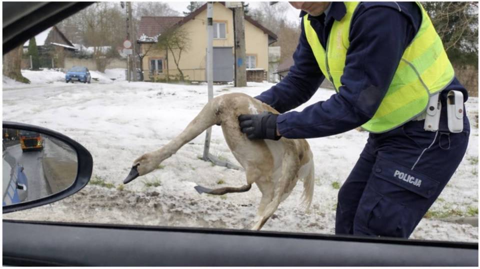 Szybka reakcja policjantów tomaszowskiej drogówki pozwoliła uratować młodego łabędzia, który 10 lutego 2026 roku zakleszczył się w konstrukcji mostu na drodze krajowej numer 48 w Inowłodzu.