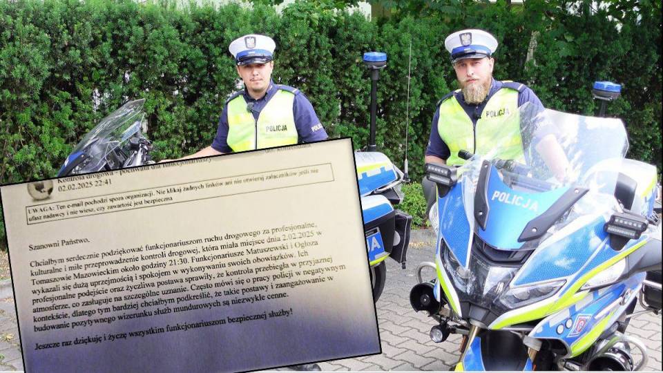 Na ręce Komendanta Powiatowego Policji w Tomaszowie Mazowieckim inspektora Tomasza Jędrzejczyka, wpłynęło podziękowanie dla sierż. Patryka Matuszewskiego i sierż. Piotr Ogłozy z Wydziału Ruchu Drogowego tomaszowskiej jednostki. Kierowca, który został poddany kontroli przez policyjny patrol, docenił zaangażowanie, empatię i profesjonalizm jaki cechuje wymienionych funkcjonariuszy.