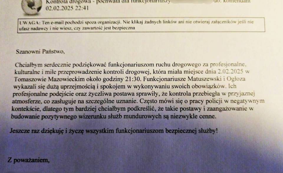 W wiadomości e-mail skierowanej do Komendanta, autor składa serdeczne podziękowania za profesjonalne, kulturalne i miłe przeprowadzenie kontroli drogowej, która zrobiła na nim bardzo pozytywne wrażenie. Kontrolę przeprowadzono w dniu przesłania wiadomości tj. 02.02.2025 roku około godziny 21:30, podczas której jak podkreśla autor e-maila, policjanci wykazali się dużą uprzejmością i spokojem a ich profesjonalne i życzliwe podejście sprawiły, że prowadzona kontrola drogowa przebiegła w przyjaznej atmosferze, co jak podkreślił autor zasługuje na szczególne uznanie i buduje pozytywny wizerunek służb mundurowych. Na koniec wiadomości autor, życzył wszystkim funkcjonariuszom bezpiecznej służby.