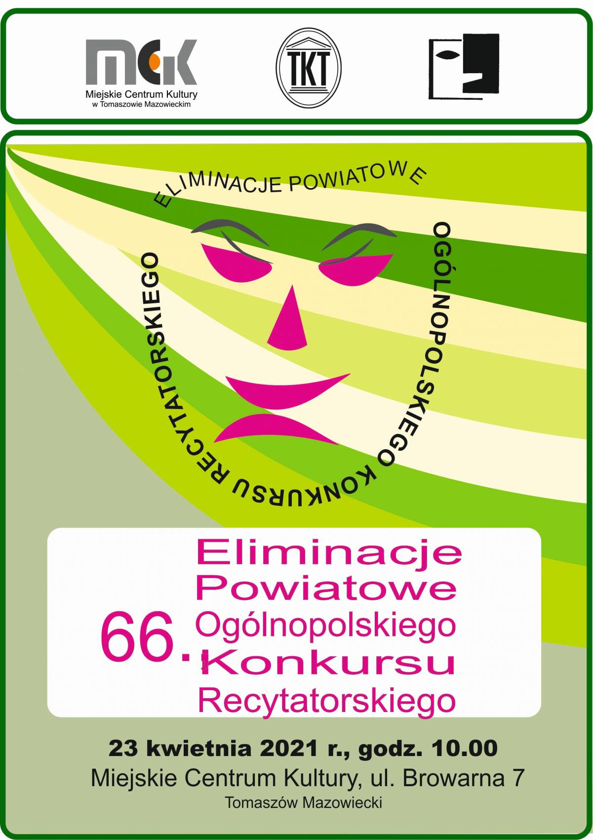 Kochasz poezję? Chcesz się zmierzyć z interpretacją wybranych utworów? A może wolisz je zaśpiewać lub przedstawić w teatrze jednego aktora? MCK zaprasza zatem na powiatowe eliminacje 66. Ogólnopolskiego Konkursu Recytatorskiego, które odbędą się 23 kwietnia o godz. 10 w Miejskim Centrum Kultury w Tomaszowie Mazowieckim przy ul. Browarnej 7.