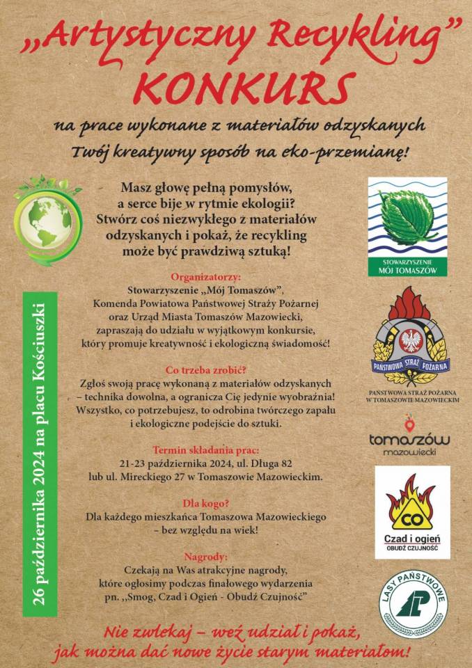Konkurs „Artystyczny recykling" zostanie rozstrzygnięty na placu Kościuszki w Tomaszowie Mazowieckim 26 października 2024 roku o godzinie 10. Podczas tego wydarzenia odbędzie się piknik ekologiczny o nazwie "Smog, czad i ogień – obudź czujność". Organizatorzy podczas pikniku zwrócą uwagę na problemy związane z zanieczyszczeniem powietrza i bezpieczeństwem przeciwpożarowym oraz nagrodzą twórców najlepszych prac wykonanych z materiałów odzyskanych.