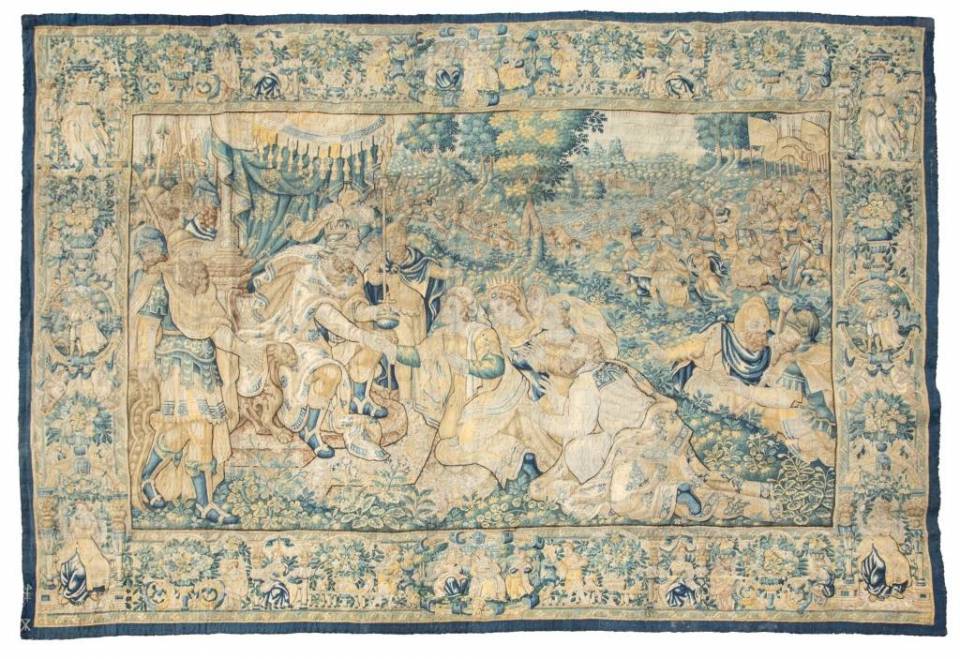 Najbardziej okazałym nabytkiem jest gobelin. Ma wymiary 343 x 467 cm. Wyprodukowany został w renomowanej wytwórni Oudenaarde a jego twórcą był Pieter Van der Kercken. Świadczy o tym sygnatura umieszczona na tkaninie. Scena na gobelinie nawiązuje do bitwy pod Issos z 333 r. p.n.e., gdy Aleksander Macedończyk pokonał perskiego króla Dariusza III. Gobelin pochodzi z paryskiego domu Zofii Urusov Radziwiłł. Po bezpotomnej śmierci księżnej w 1889 r. jej majątek przejęli wierzyciele oraz jedna z siostrzenic – księżna Barszczow. Dekoracyjną tkaninę kupiła do kolekcji Fundacji Trzy Trąby Zofia Radziwiłł w paryskim Maison Jansen.
