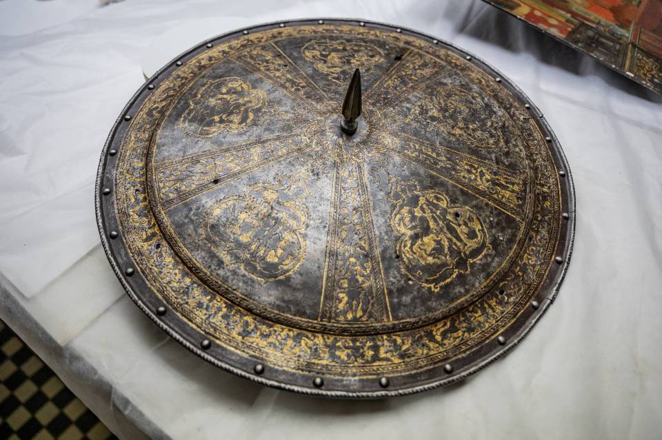 Ostatnim, najcenniejszym obiektem jest renesansowa okrągła tarcza rycerska, datowana na drugą połowę XVI w. Tego typu zdobione tarcze, we Włoszech znane jako rotella, były wytwarzane w Mediolanie. Na powierzchni tarczy widnieje data 1719 oraz herb Sabaudii z inicjałami VA, co odnosi się do czasów panowania Wiktora Amadeusza II (1675–1730). Bogate grawerunki oraz złocenia ogniowe wskazują, że mogła być przeznaczona dla wysokiego rangą dowódcy.