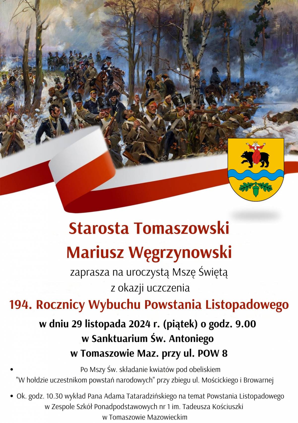 Mariusz Węgrzynowski – Starosta Powiatu Tomaszowskiego, zaprasza na uroczystą mszę świętą w Sanktuarium św. Antoniego w Tomaszowie Mazowieckim w piątek, 29 listopada 2024 roku, o godzinie 9.00, poświęconą 194. rocznicy wybuchu powstania listopadowego.