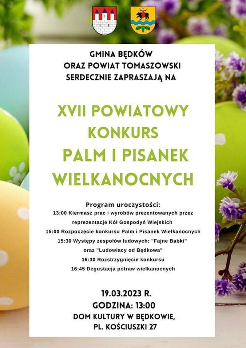 Gmina Będków i Powiat Tomaszowski zapraszają na XVII Powiatowy Konkurs Pisanek i Palm Wielkanocnych, który odbędzie się w niedzielę, 19 marca 2023 roku, od godziny 13.00 w Domu Kultury w Będkowie, pl. Kościuszki 27.